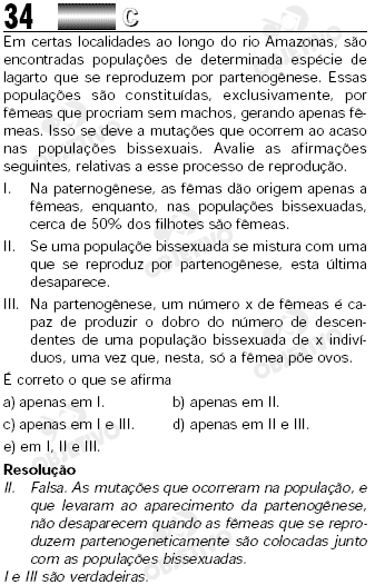 Em certas localidades ao longo do rio Amazonas, são encontradas populações de determinada espécie de lagarto que se reproduzem por partenogênese. Essas populações são constituídas, exclusivamente, por fêmeas que procriam sem machos, gerando apenas fêmeas. Isso se deve a mutações que ocorrem ao acaso nas populações bissexuais. Avalie as afirmações seguintes, relativas a esse processo de reprodução.