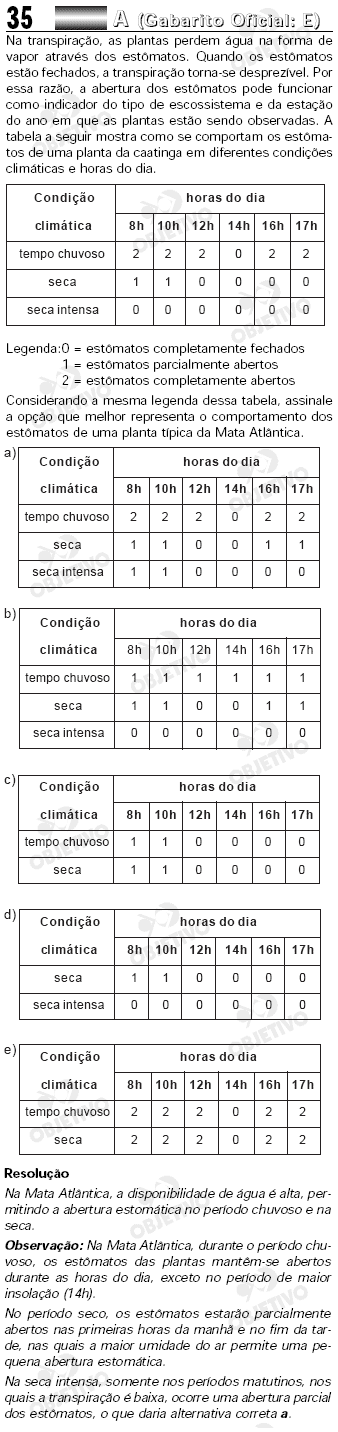 Na transpiração, as plantas perdem água na forma de vapor através dos estômatos. Quando os estômatos estão fechados, a transpiração torna-se desprezível. Por essa razão, a abertura dos estômatos pode funcionar como indicador do tipo de ecossistema e da estação do ano em que as plantas estão sendo observadas. A tabela a seguir mostra como se comportam os estômatos de uma planta da caatinga em diferentes condições climáticas e horas do dia.