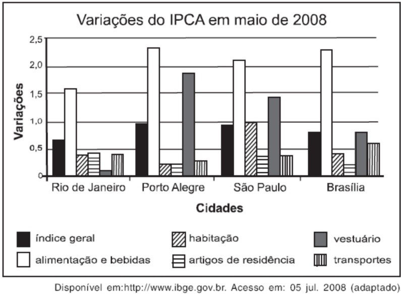 Para o cálculo da inflação, utiliza-se, entre outros, o índice Nacional de Preços ao Consumidor Amplo (IPCA), que toma como base os gastos das famílias residentes nas áreas urbanas, com rendimentos mensais compreendidos entre um e quarenta salários mínimos. O gráfico a seguir mostra as variações do IPCA de quatro capitais brasileiras no mês de maio de 2008. Com base no gráfico, qual item foi determinante para a inflação de maio de 2008