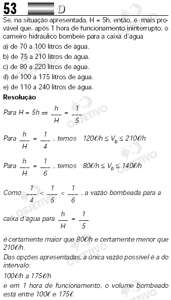Se, na situação apresentada, H = 5 × h, então, é mais provável que, após 1 hora de funcionamento ininterrupto, o carneiro hidráulico bombeie para a caixa d'água