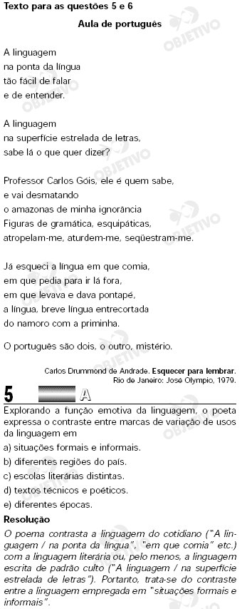 Explorando a função emotiva da linguagem, o poeta expressa o contraste entre marcas de variação de usos da linguagem em