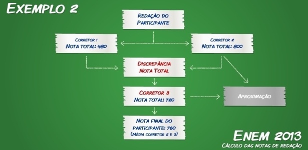 Neste segundo exemplo, a diferença entre as notas dos dois corretores foi de 320 pontos. Isso leva a uma nova correção, feita por um terceiro avaliador. Se a menção deste terceiro se aproximar de alguma das outras duas, será feita uma média aritmética as mais próximas. Essa será a nota final do candidato Arte/UOL