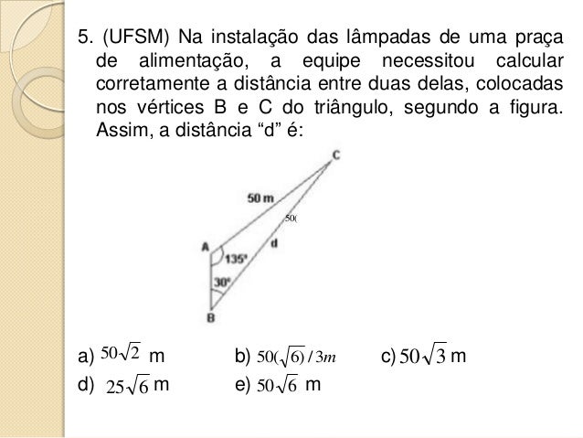 Na instalação das lâmpadas de uma praça de alimentação, a equipe necessitou calcular corretamente a distância entre duas delas, colocadas nos vértices B e C do triângulo, segundo a figura. Determine a distância "d".