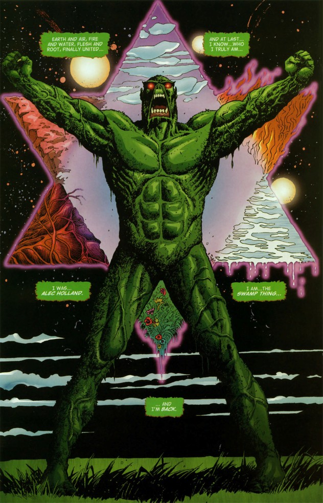 Seu corpo tinha sido mergulhado na fórmula Bio-Restaurativa, e isso afetou as plantas do pântano, fundindo elas com o Consciente e as Memórias de Alec, a forma de vida tomou uma forma antropomórfica e levantou como O Monstro do Pântano, o último em uma longa linha de elementares criados para proteger O Verde.