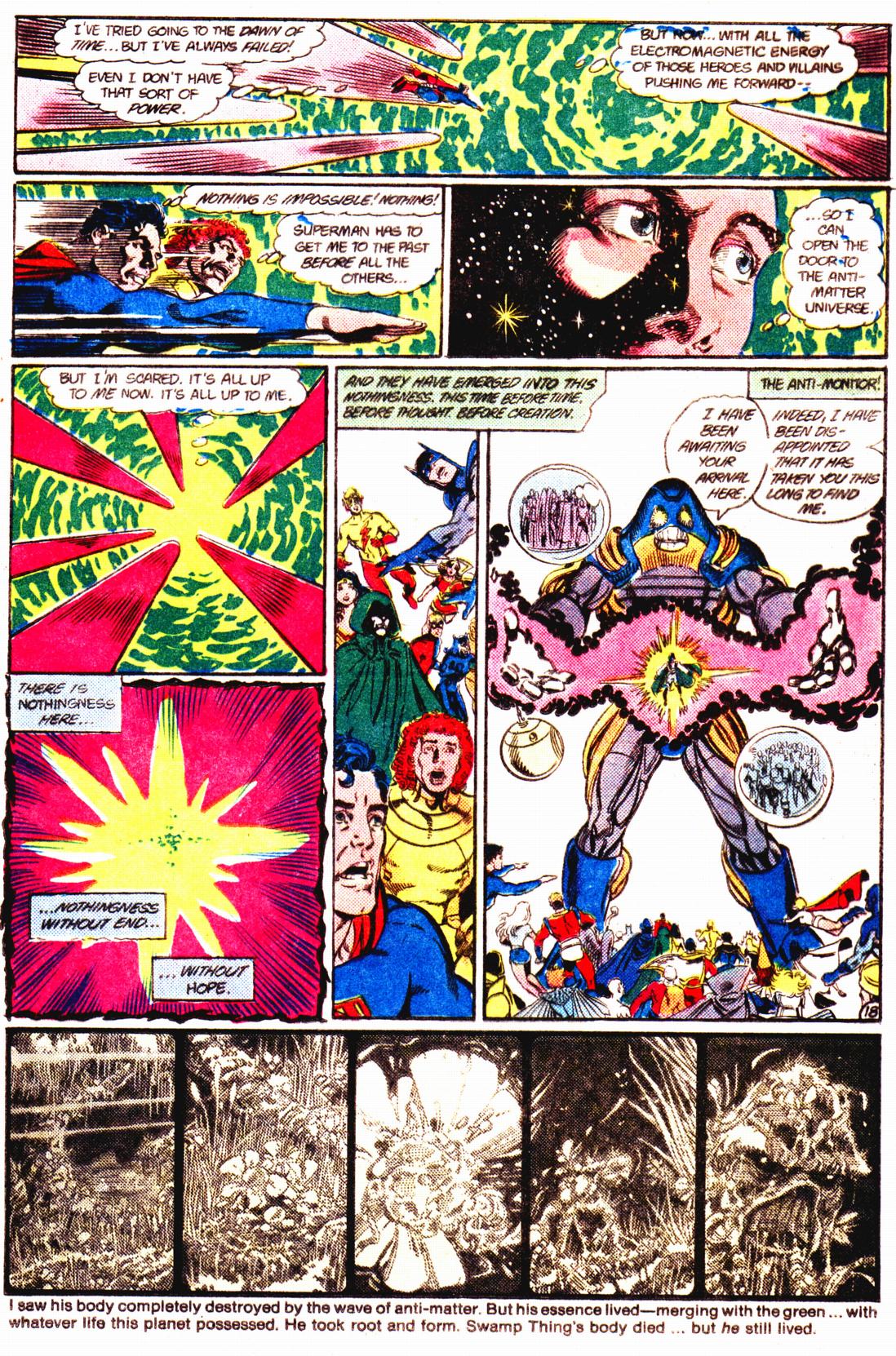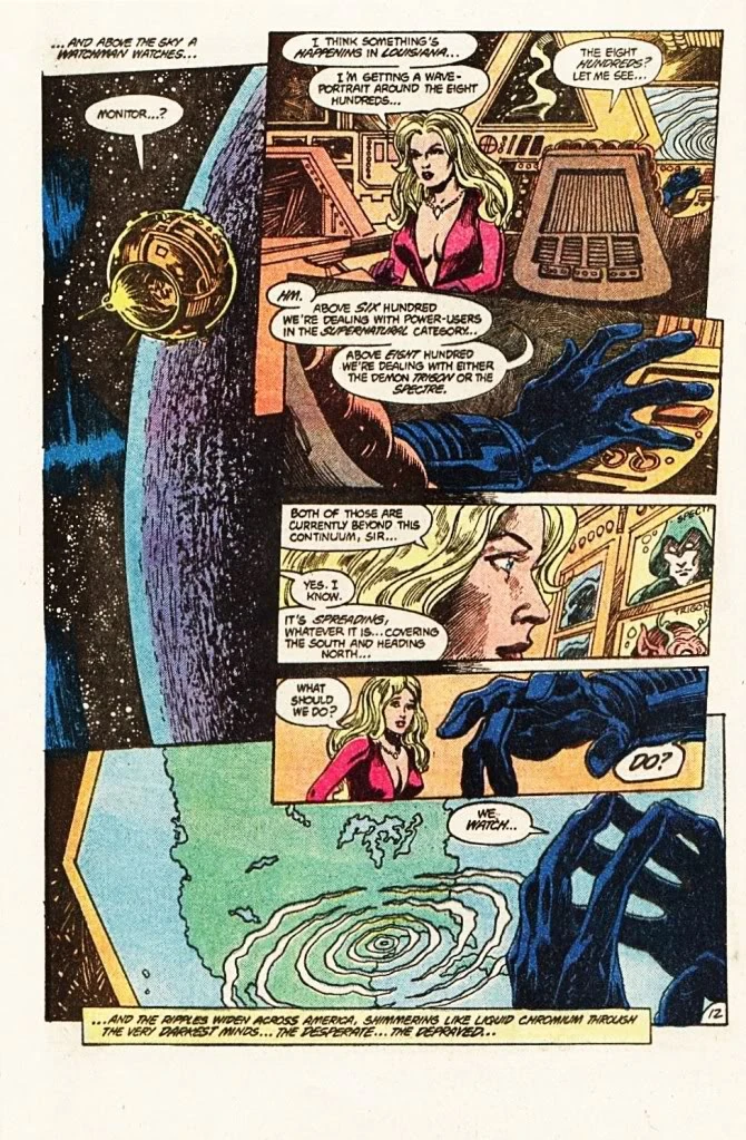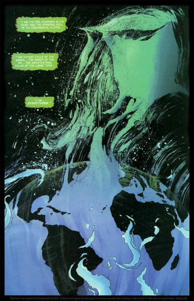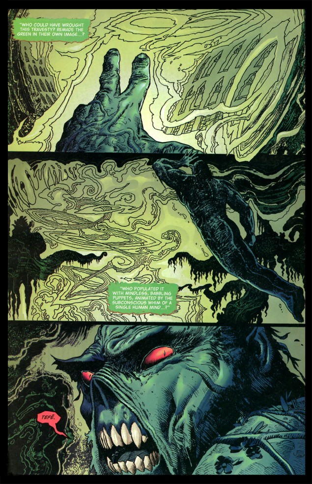 Ataque: Universal (Foi descrito como sendo um com o mundo/O Universo várias vezes, personifica e tem controle sobre as forças que constituem a criação. Lutou e derrotou um homem que foi descrito pelo Monitor como tendo o mesmo poder que Trigon e O Espectro). Infinita Com poder Máximo (Depois de ser separado de Alec Holland e se livrar de seus bloqueios mentais, O Monstro Do Pântano foi capaz de refazer O Verde com um gesto. Note que o Verde é um reino metafísico que está conectado a toda a criação, e que não foi afetado pelo colapso do Multiverso Pré-Crise) | Infinita (Existe no nível do Parlamento dos Mundos, que existem além do Verde e dos Parlamentos, e provavelmente, do Multiverso inteiro, já que a sua verdadeira habitação deles nunca é mostrada, e eles apenas estavam em um Mapa 4D que permitiu que Alec Holland encontrasse a sua próxima incarnação)